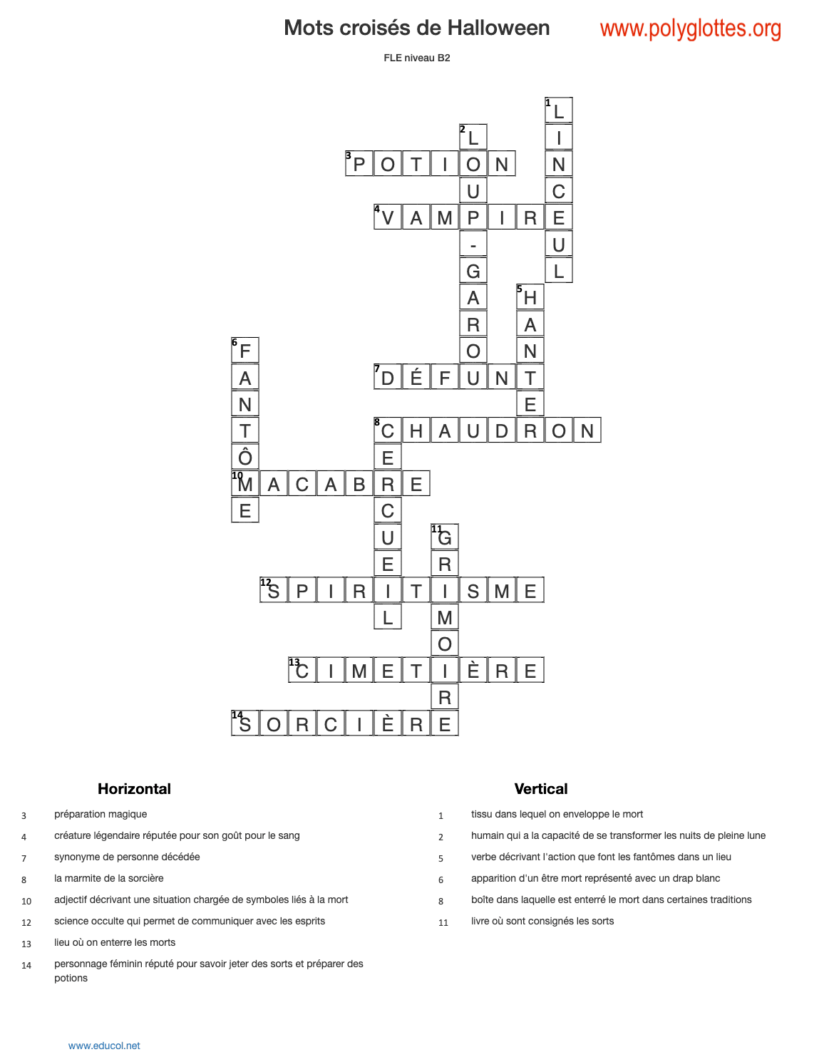 On vous a concocté un petit jeu de mots croisés avec 14 mots sur le thème d’Halloween. Ce jeu est parfait pour des élèves FLE de niveau B2 ou plus. Les tirets sont autorisés dans la grille.